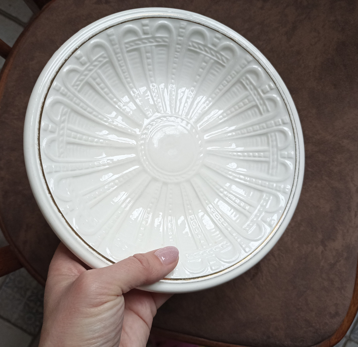 В диаметре тарелка 20 см, по высоте 2 см. Белоснежная, по краю золотой ободок, рисунок очень рельефный, выпуклый. Золотая кайма правда немного подстерлась, но зато ни сколов. ни царапин на самой тарелке нет. Тарелка хоть и не большая по размеру (как десертная), но довольно весомая, потому как сделана из толстостенного фаянса.