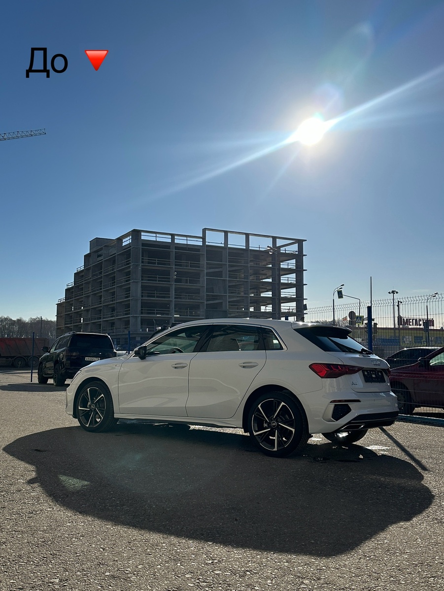Комплексно забронировали Audi A3, оклеили крышу в черную полиуретановую пленку, покрасили зеркала, сделали антихром и притемнили переднюю оптику.