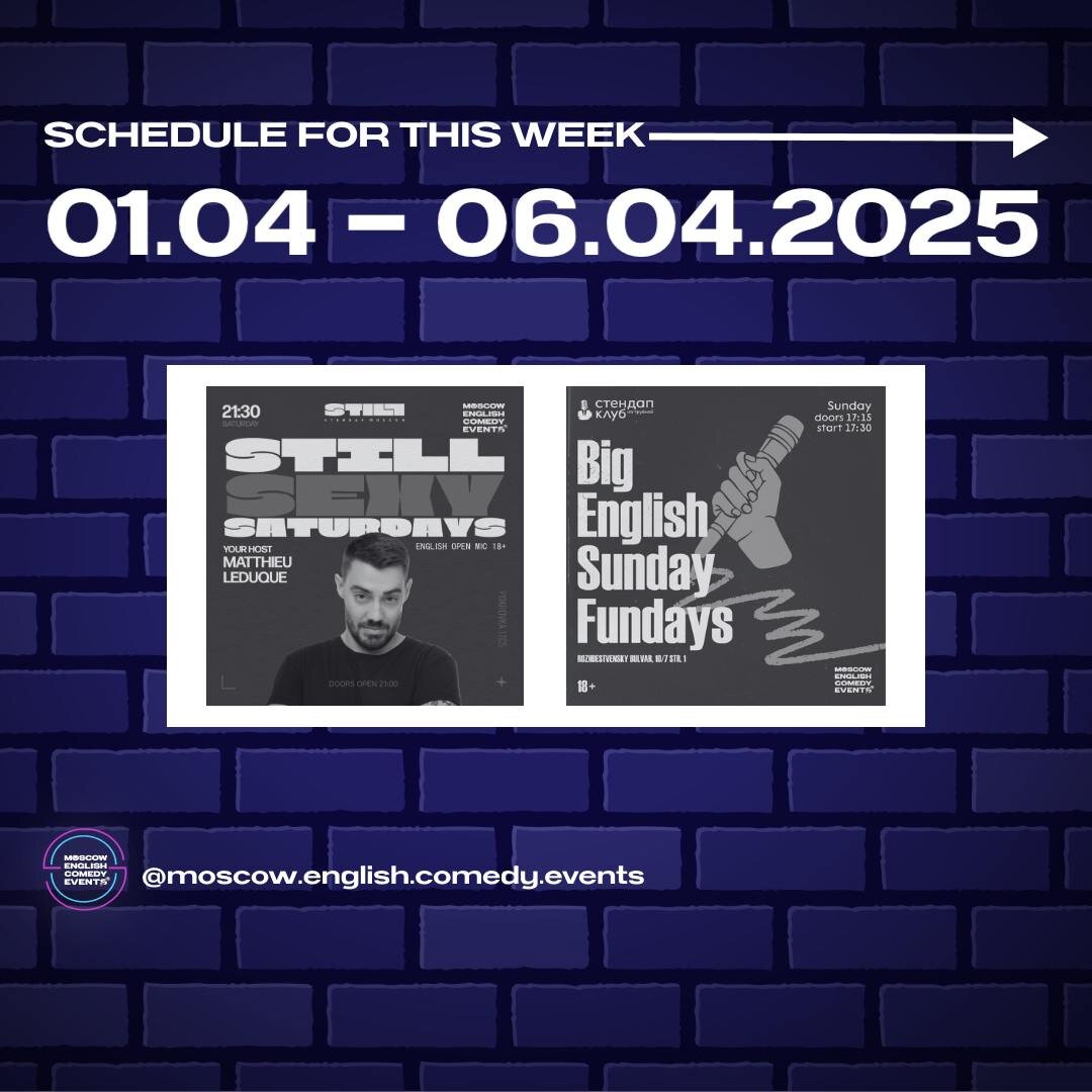 Schedule for this week (01.04– 06.04)❗️ -----‐----------------------- 🕤Saturday, April 5th, 9:30 PM – Still Sexy Saturdays 🎤Open Mic 🎟Entrance: Pay what you want (any paper note or transfer) 💵 🔗 Register for free 🫰 pay upon arrival 📍Still StandUp Moscow 🗺 Pokrovka 17c5, through the arch with the pink lights 🏙 Blue building directly inside the courtyard -----‐----------------------- 🕠Sunday April 6th, 5:30 PM - Big English Sunday Fundays 📺Special appearances by famous Russian comics 🎟️Entrance: FREE 💸 Donations welcome, one drink minimum 🔗Reserve for free 📍Stand Up Club на Трубной 🗺 Map: Rozhdestvensky Blvd, 10/7 С1
