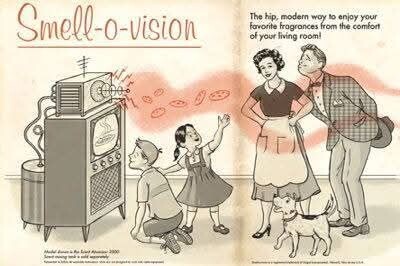 Телеканал английского города Манчестера провёл любопытный эксперимент. В научно-популярной передаче на экране появился сложный прибор конусовидной формы, опутанный проводами и мигающий разноцветными индикаторами. Ведущий программы объяснил, что учёные изобрели способ передавать запахи по радиоволнам прямо в квартиры телезрителей и прибор представляет собой передатчик запахов. Аромат, который сейчас впервые будет транслироваться в телеэфире, накапливался в конусе 23 часа. Это всем знакомый запах, ассоциирующийся обычно с сельской местностью. Но не запах навоза, подчеркнул ведущий. Специальные датчики записывали частоты колебаний, совершаемых пахнущими молекулами. Затем эти колебания накладываются на обычный видеосигнал, телевизор их улавливает, усиливает и излучает в комнату. Мозг телезрителя интерпретирует полученный раздражитель как запах. Ведущий попросил зрителей позвонить в студию, когда начнётся трансляция, и сообщить о своих ощущениях. «Даже если вы никакого запах