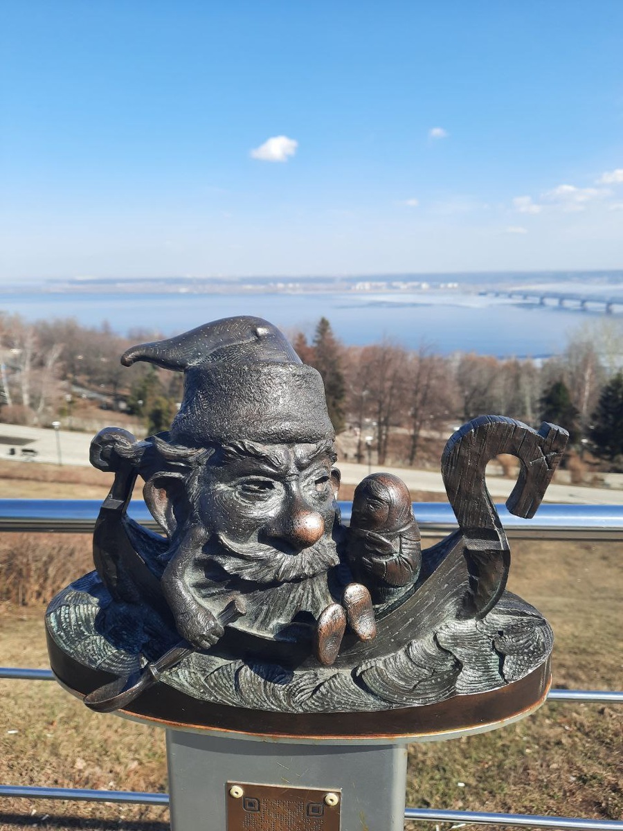 Время обеда, а значит, время поговорить о колобке. Ульяновск отстоял право считаться родиной пирожка-бунтаря. Согласно словарю Даля именно жители Симбирской губернии в разговорной речи употребляли слово «колебятка». Оно означало «последнее тесто из квашни». Как известно, для создания колобка муку, как раз, наскребали по сусекам. 2 июня 2012 года в селе Новая Беденьга состоялось официальное открытие усадьбы Колобка. А осенью 2024 по городу разбежались бронзовые колобки: колобок-Обломов на диване у краеведческого, колобок с трубой, как у музы Клио на памятнике Карамзину, в сквере Карамзина, колобок в цилиндре, символизирующий симбирского поэта Николая Языкова, стихи которого сам Александр Пушкин считал лучше своих. А мы познакомились с тем, что у памятника Богдану Хитрово. С колобком- казаком или Стенькой Разиным. Он сидит на бинокле на смотровой. Если перейти по ссылке через куаркод, можно узнать, что что знаменитую песню «Из-за острова на стрежень» сочинил симбирянин Дмитрий Садовни