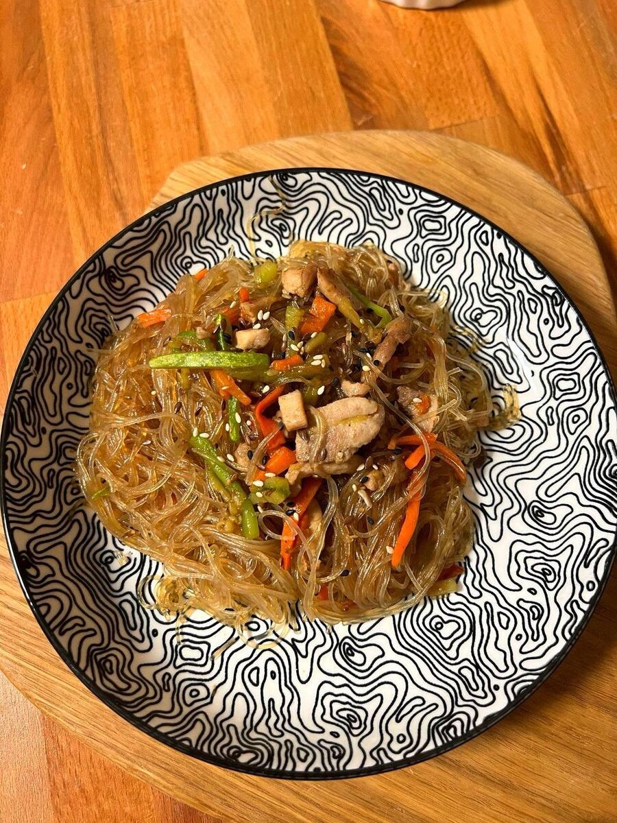 🔠🔠🔠🔠🔠🔠🔠 🔠🔠🔠🔠🔠 Ингридиенты: ❣️Филе бедра цыпленка (без кости) - 200 гр ❣️Кабачок - 1 маленький ❣️Морковь - 1 маленькая ❣️Перец болгарский - 1/2 перца ❣️Зубчик чеснока ❣️Соль и специи по вкусу ❣️Кунжут ❣️Фунчоза Приготовление: 1️⃣Обжарить филе бедра на нерафинированном масле авокадо (можно взять масло ГХИ), выдавить зубчик чеснока. После того как филе обжарили, добавляем овощи (нарезанные соломкой). Хорошо всё вместе обжариваем, добавляем специи, соль. 2️⃣Фунчозу залить горячей водой и оставить на 5-7 минут. 3️⃣Промыть фунчозу и добавить к куриному филе и овощам, добавить соевый соус и тушить 10 минут. 5️⃣При подаче можно добавить кунжутные семечки и свежий зелёный лук. 6️⃣Блюдо можно подавать двумя способами: горячим или холодным в виде салата Приятного аппетита!🫶 #Нутрициология #Рецепты #ПроЕду