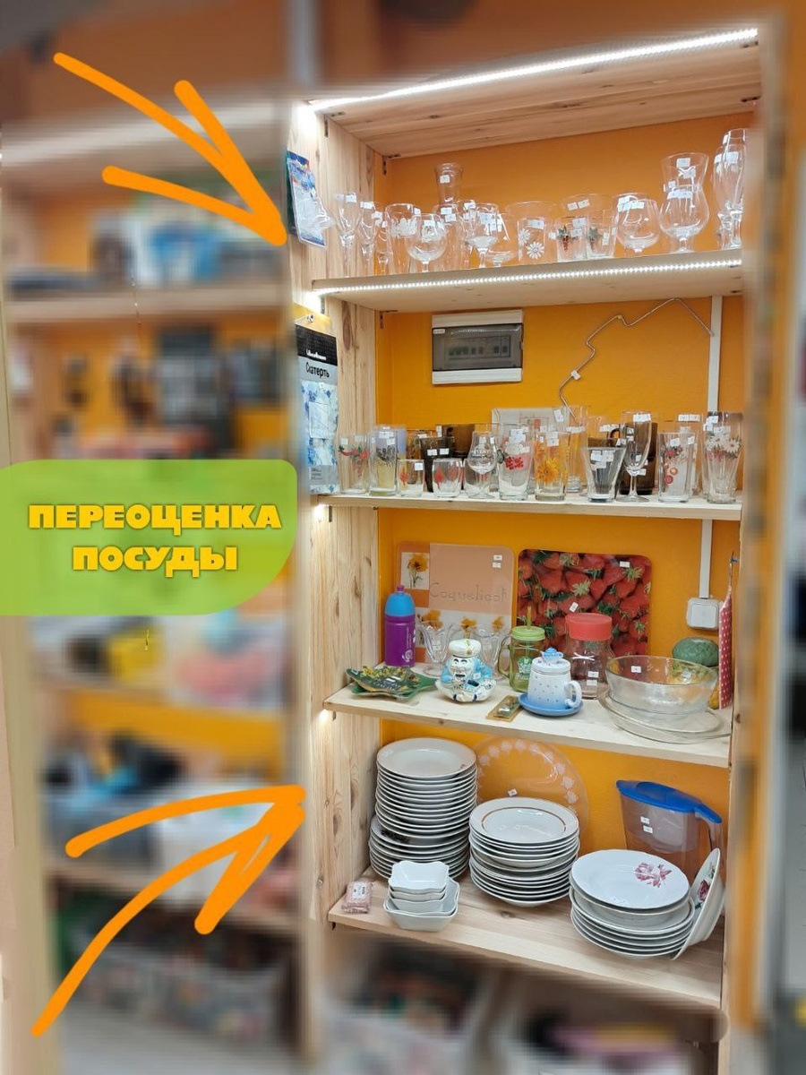 🔸 Отдельный стеллаж с посудой по сниженным ценам - есть тарелки по 20-50₽, бокалы по 30₽ и другое