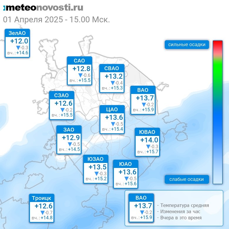 В 15:00 в Москве было от +11.8°C до +14.3°C, средняя температура +13.2°C #погода #Москва #весна #температура #1апреля #вторник Перейти на сайт Прогноз погоды на 14 дней