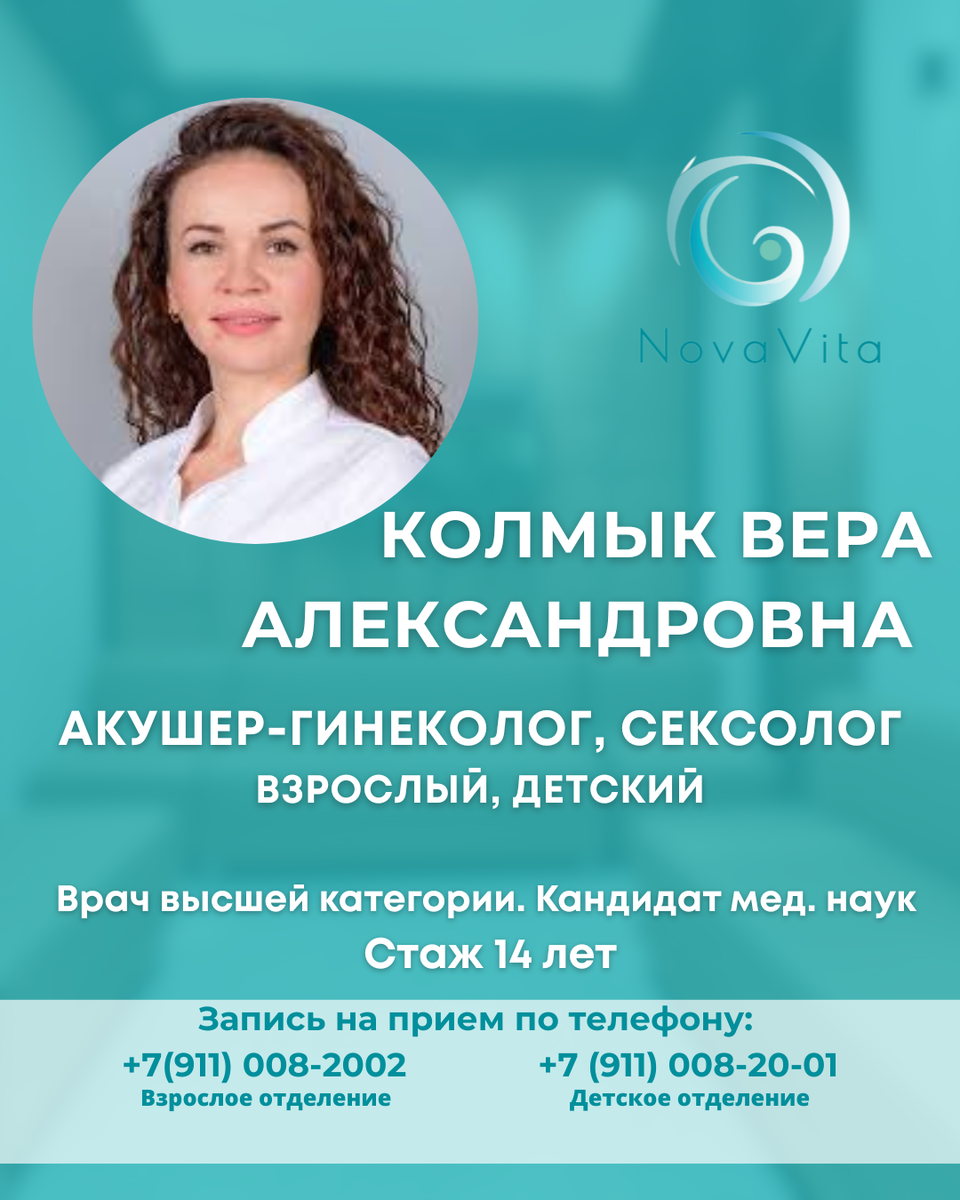 Колмык Вера Александровна Акушер-гинеколог, сексолог Взрослый, детский Врач высшей категории Кандидат мед. наук Стаж 14 лет Вера Александровна является высококвалифицированным специалистом, заботящимся о женском здоровье на всех этапах жизни. 📚 Сфера деятельности: ▪️Ведение беременности и планирование ▪️Диагностика и лечение воспалительных заболеваний ▪️Подбор гормональной контрацепции ▪️Коррекция гормонального фона при климаксе ▪️Радиоволновое лечение заболеваний шейки матки ▪️Ультразвуковая диагностика ▪️Лечение экстренных и плановых гинекологических патологий 📚 Образование: ▪️Санкт-Петербургский государственный педиатрический медицинский университет (2010) ▪️2012 г. – ординатура по специальности «Акушерство и гинекология» на базе СПбГПМА ▪️2019 г. – защита диссертации на тему «Клинико-морфологическая характеристика хронического эндометрита у женщин с отягощенным акушерско-гинекологическим анамнезом» на базе СПБГПМУ. Присуждена учёная степень кандидата медицинских наук Дополнительн