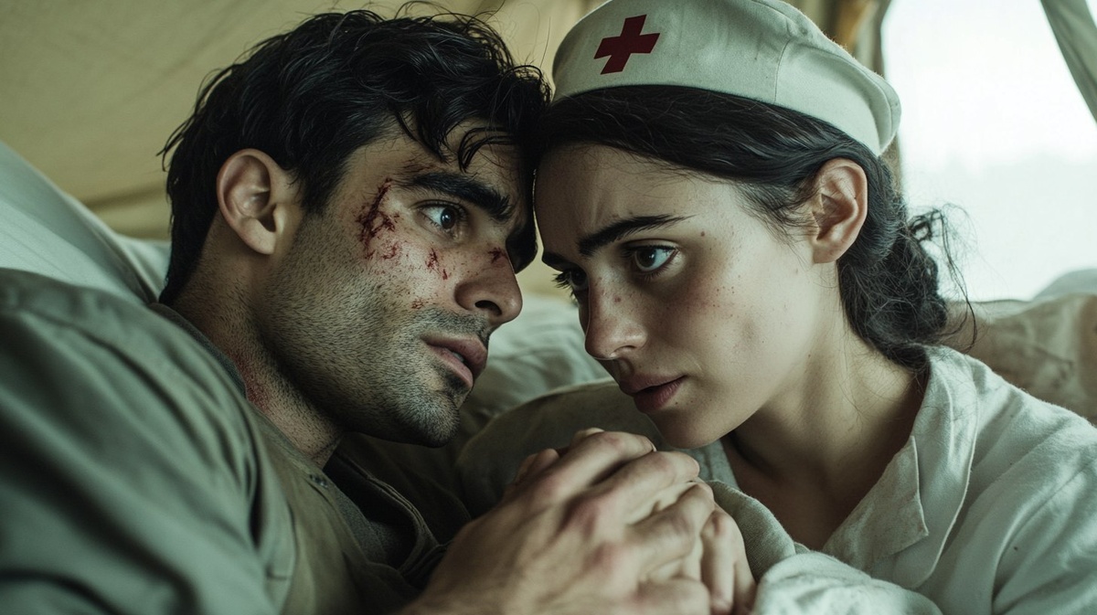 Создано на основе запроса: A realistic, bright and emotionally powerful close-up scene inside a World War II field hospital tent during early morning. A wounded soldier, Captain Gabriel Torres, lies in bed with his eyes open for the first time