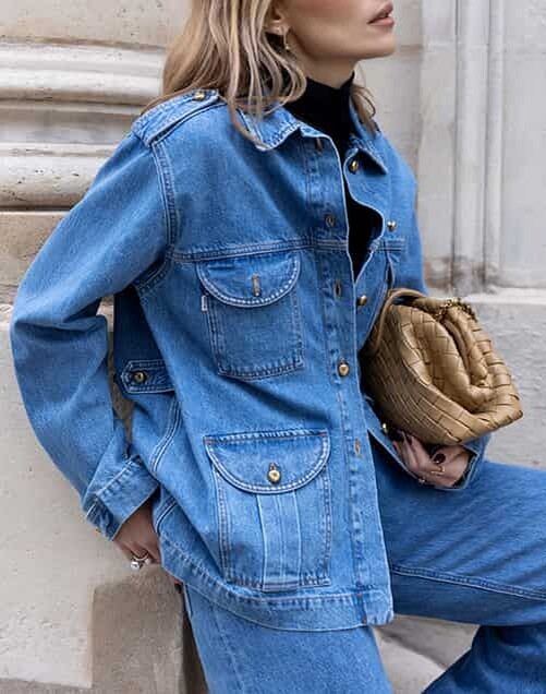 1. Джинсовая рубашка, джинсы и бежевые аксессуары