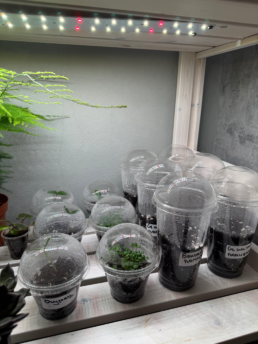 Покупной грунт сделала рыхлым с помощью перлита, добавила удобрение Цион. Взяла индивидуальные теплички для каждого растения и наполнила их грунтом. Для помидоров насыпала чуть больше половины стаканчика грунта, для огурцов и рукколы наполнила целый стакан отступив от края 2-3 см. Землю очень хорошо взбрызнула раствором вода+HB101+удобрение для рассады (всё наводила по инструкции). Сделала небольшие углубления 2-3 см и посадила в них семена (помидоры и огурцы: 1 семя в один стакан, рукколу насыпала в один стакан около 10-15 семян), семена немного присыпала землёй. Накрыла крышками. Поставила на стеллаж под фитолампы.