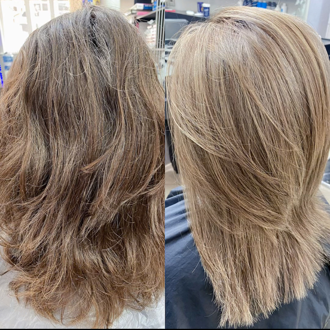 Многие женщины сталкиваются с проблемой седых волос и ищут способы, чтобы скрыть их, не прибегая к радикальным изменениям цвета. В данном случае клиентка обратилась с пожеланием освежить образ, добавив светлые оттенки, но при этом сохранить естественный вид. Решение было найдено в виде мелирования и последующей тонировки на девятом уровне. Мелирование позволило создать мягкие переливы света в волосах, делая их визуально более объемными и живыми. Этот метод идеально подходит для тех, кто хочет добавить яркости своему образу, не окрашивая волосы полностью. Светлые пряди гармонично вписались в общий тон волос, создавая эффект естественного выгорания на солнце. После мелирования была проведена тонировка на девятом уровне. Тонирование помогло сгладить переход между натуральным цветом волос и осветленными прядями, придавая прическе законченный и ухоженный вид. Девятый уровень тона позволил достичь теплого блонда, который мягко подчеркивает черты лица и придает коже свежий и отдохнувший в