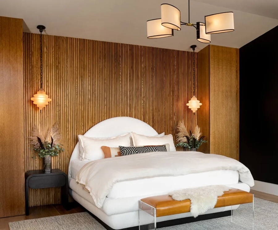 Кроме того, не забудьте добавить в интерьер тёплые и интересные детали на стены. Это придаст комнате эстетическую привлекательность и создаст вокруг кровати ощущение кокона. Создайте акцентную стену, чтобы добавить немного архитектурной текстуры и интереса, а также используйте простые и лаконичные постельные принадлежности и несколько элементов скульптурного освещения, которые добавят изюминку в общий облик.