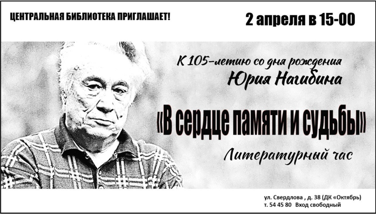 ✨ Литературный час "В сердце памяти и судьбы" посвященный 105-летию со дня рождения Юрия Нагибина. Советского и российского писателя, журналиста и прозаика, сценариста, автора мемуаров. 🎞️В том числе был автором сценария фильмов, которые вы все хорошо знаете: "Гардемарины, вперёд! ", "Виват, гардемарины", "Гардемарины III" 🚫 Возраст: 12+ 📆 02.04.2025 🕒 15:00 🏢 Центральная библиотека 📍 г. Подольск, ул. Свердлова, д. 38 💰 Вход свободный❗️ #webПодольск ✅ Мероприятия Подольск https://dzen.ru/id/66ed500f7b5671493eca3fd6 http://vk.com/podolsk_events http://dzen.ru/podolsk_events