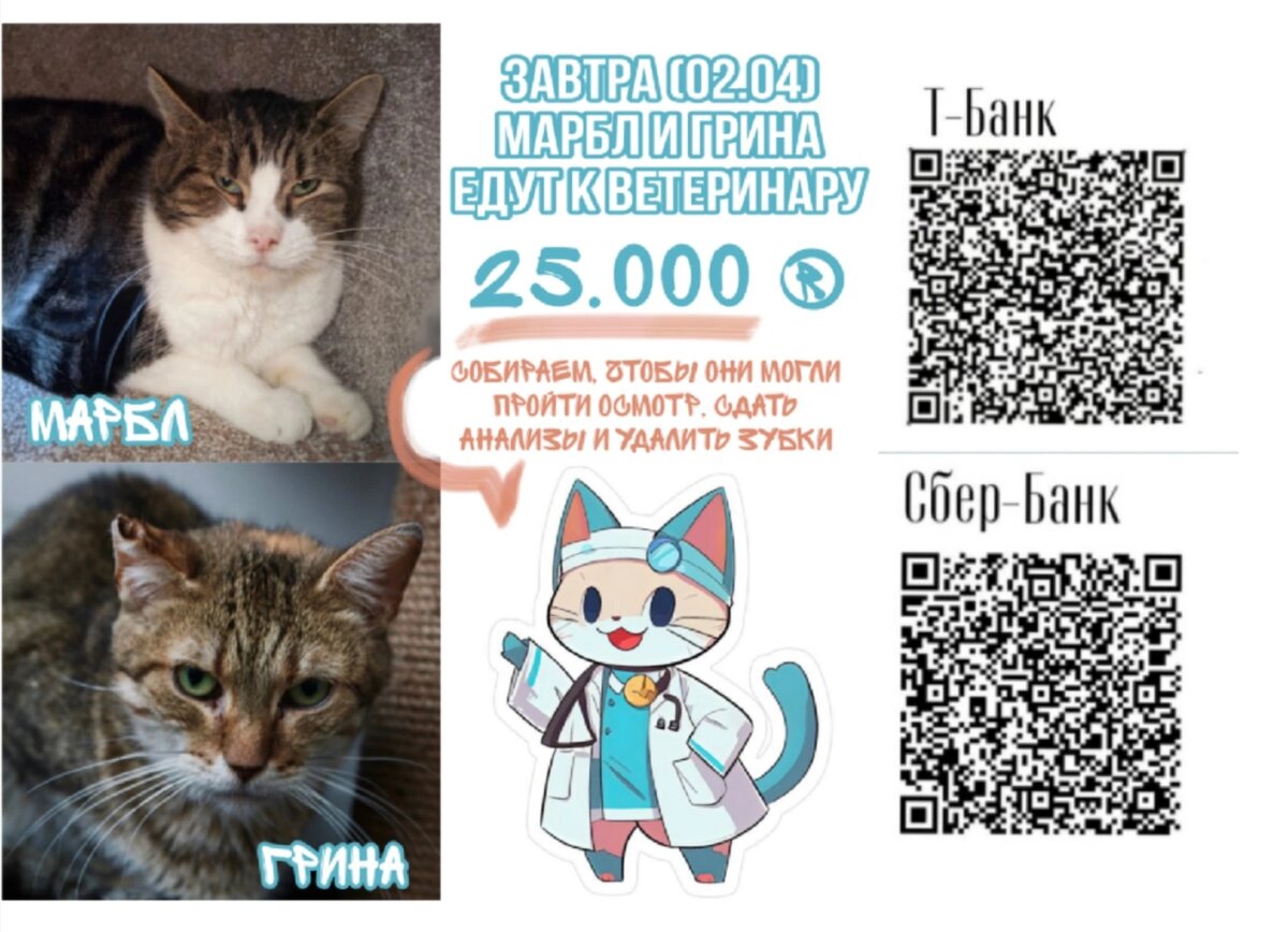 Походы ко врачам важны не только людям! Завтра (02.04.2025) Марбл и Грина отправятся к ветеринару: их ждут осмотр, сбор анализов и удаление зубок. Приюту едва хватает средств на то, чтобы закрывать основные траты на содержание наших пушистых. Свои коррективы вносят и хвостики, которые были брошены под дверью приюта... Осмотр и ветеринарные манипуляции для Марбл и Грины выйдут на 25.000 рублей. Сумма вроде бы и небольшая, но времени на сборы одни сутки🥲 Пожалуйста, помогите нам позаботиться о здоровье двух наших давних подопечных 🙏 ‼ВАЖНО‼ При формулировке перевода писать только (все формулировки без "благотворительно" облагаются налогом!): Благотворительно КХ КУ 📳Реквизиты для благотворительных переводов пожертвований: ⚫Р/с Тинькофф Межрегиональная общественная благотворительная организация "ЗооЗащита" ИНН 7801269951 КПП 781601001 ОГРН 1107800008788 Расчетный счет 40703810900000736071 Банк АО "Тинькофф Банк" БИК банка 044525974 Корреспондентский счет банка 30101