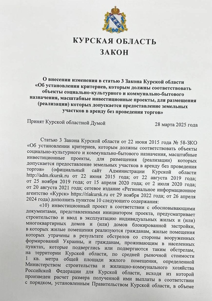 В Курской области приняли новый закон для поддержки дольщиков и переселенцев Куряне, чьи дома были разрушены от обстрелов, получат новое жилье по фиксированной цене. Застройщики, участвующие в программе, выделят не менее 20 процентов квартир для льготных категорий граждан. Стоимость жилья будет регулироваться Минстроем РФ. В новом законе предусмотрены меры для защиты интересов дольщиков, если их стройки «заморожены». Инвесторы, согласно новому закону, обязаны завершить строительство или компенсировать ущерб. В противном случае, если застройщик не выполнит свои обязательства, лишится права на получение земли без торгов.