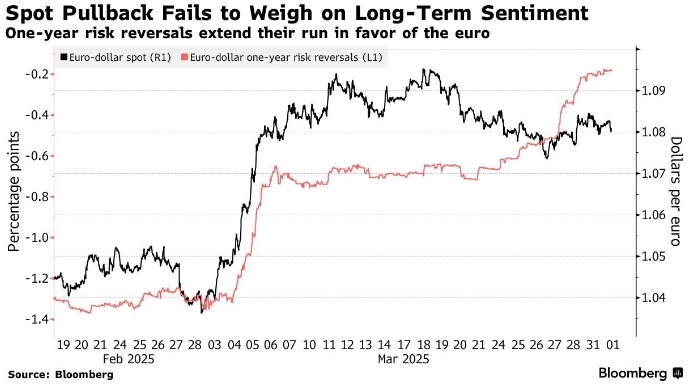 Переоценка настроений также заметна в долгосрочной перспективе. Хотя развороты рисков на год всё ещё предполагают, что евро будет слабее через 12 месяцев, этот показатель в марте подскочил до второго по величине значения за всю историю, что указывает на то, как быстро трейдеры становятся более оптимистичными в отношении валюты.