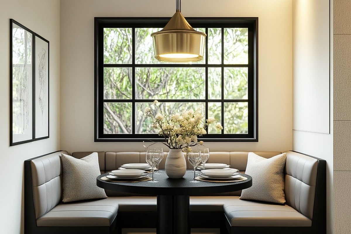 Создано на основе запроса: small dining nook area, walls are off white, the window is black framed boxes but a large window with 12 frames