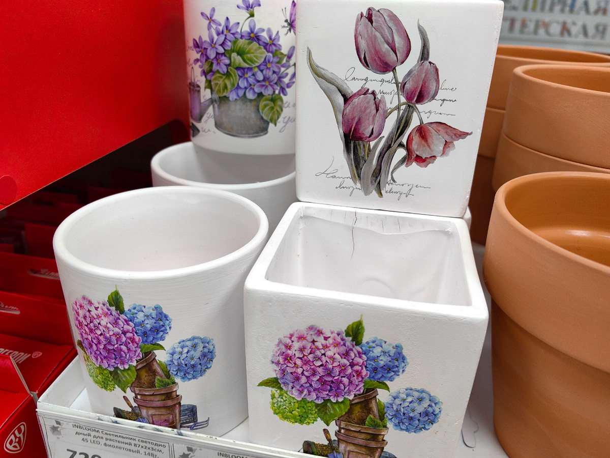 Какие классные новинки выставили в магазине Галамарт, первыми на глаза попались кашпо для цветов, кому как больше нравятся - круглые или квадратные, в одном стиле. И смотря какой формы готовый горшочек с цветком. Хорошее оформление, могут быть с веточками гортензии, с букетом тюльпанов, с леечкой у цветка в горшке, или, вот, еще такое кашпо нашла, три крошечных цветка. Кашпо из керамики, примерно 10 на 9 см и 10 на 10 см. По 299р. Много всего выставили к празднованию Пасхи. Фигурки курочки и петушка на деревянной палочке, фигурки яиц, тоже топпер, по 49р и 99р. Веточка с листьями и фигурками пасхальных яиц. Пушистый цыпленок, глазки, клюв и крылья объемные. И здесь для детей наборы к Пасхе, раскрасить фигурки кроликов, краски и кисть в комплекте. Свечи в стеклянной лампадке, еще рядом свечи цветные, как пасхальные яйца. Картонные формы для кулича, большие по 4 штуки, за 99р. Еще с лисичками, детский рисунок. Помню, кто-то собирал посуду с гусями, так вот, и такие формы нашл