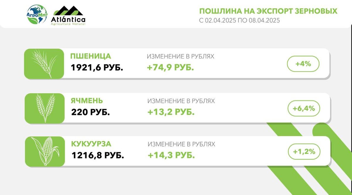 📊 Рынок зерна: мировые котировки снижаются, а пошлины растут На международных площадках продолжается падение: 🔻 CBOT — -5,37% 🔻 KCBT — -6,28% 🔻 MGE — -3,97% В то же время внутрироссийский рынок демонстрирует рост: 🌾 Индекс CPT Новороссийск — 18 650 ₽/т (+2,98%) 📌 С 2 по 8 апреля повышаются экспортные пошлины: — Пшеница: 1921,6 ₽ (+74,9 ₽ / +4%) — Ячмень: 220 ₽ (+13,2 ₽ / +6,4%) — Кукуруза: 1216,8 ₽ (+14,3 ₽ / +1,2%) Минсельхоз утвердил новые ориентиры для интервенций. Дополнительно в Госдуме рассматривается законопроект об обязательной доле биржевых продаж для зерновых — до 25%. 🚜 Посевная-2025 набирает обороты. В работу активно включились Воронежская область, Ставропольский край и Дагестан. 📍 Рекомендуем аграриям следить за изменениями и заранее оценивать возможное влияние на логистику и ценовые стратегии.
