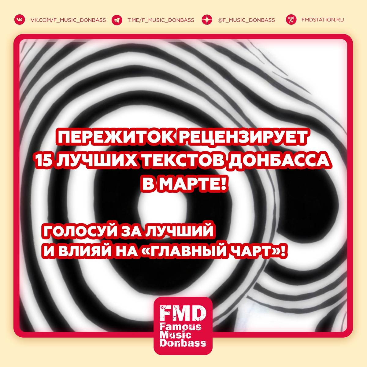Отправили 15 песен с самыми яркими стихами трёх сцен (рэп, рок, поп) внештатному автору Игорю «Пережитку» Степанову, поэту, пиарщику и журналисту с 30-летним стажем. Игорь написал рецензии на каждый трек, а мы расставили места, исходя из комментариев. Пятидневное г о л о с о в а н и е среди наших подписчиков за лучший текст проходит здесь 👇 ❗ vk.com/topic-27690252_53886179 Итоги будут отображены в «Главном чарте Донбасса»! Лучшие тексты станут номинантами на «Текст года» ПРЕМИИ FMD 2025. Слово рецензенту: Сначала я должен сделать признание. Я взялся обозревать слова песен с уверенностью, что в любом тексте обязательно найдётся что-то, достойное если не восхищения, то хотя бы понимания: строфа, строчка, слово, рифма — и до сих пор так и было… Но прошло. 🎗 15 место. Venteris, Anneliya — В плену огня (Луганск) Появился невероятный текст, в котором нет вообще ничего, гладкий, как кусок мыла в бане, его критиковать было бы ещё сложнее, чем хвалить. Браво, Venteris, аплодисменты, Anneliya.