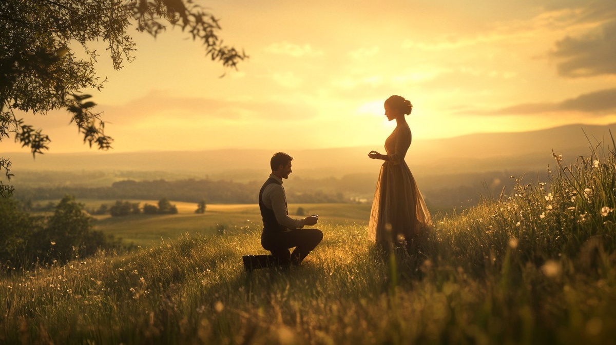 Создано на основе запроса: A highly realistic photo-style image of a peaceful hilltop at golden hour, with warm sunlight casting long shadows over green grass. In the center, a man in his early 40s with short dark hair, wearing simple post-war civilian clothes, kneels down holding a small silver ring in his hand. In front of him stands a woman in her mid-30s with olive skin and dark brown hair, gently waving in the breeze, wearing a light dress. Her expression is emotional and touched. The sky is open and glowing with soft sunset colors, and the background shows wide, peaceful countryside. The atmosphere is calm and romantic, with a photographic, cinematic quality --- Автоперевод: Очень реалистичное изображение фото в стиле фото мирного холма в Золотой час, с теплым солнечным светом, отбрасывающим длинные тени над зеленой травой. Как тебе такая генерация? 🤔 https://dzen.ru/id/65c0c65c86e4f837c27b24d7 #ИИ #AI #нейросеть #midjourney #art