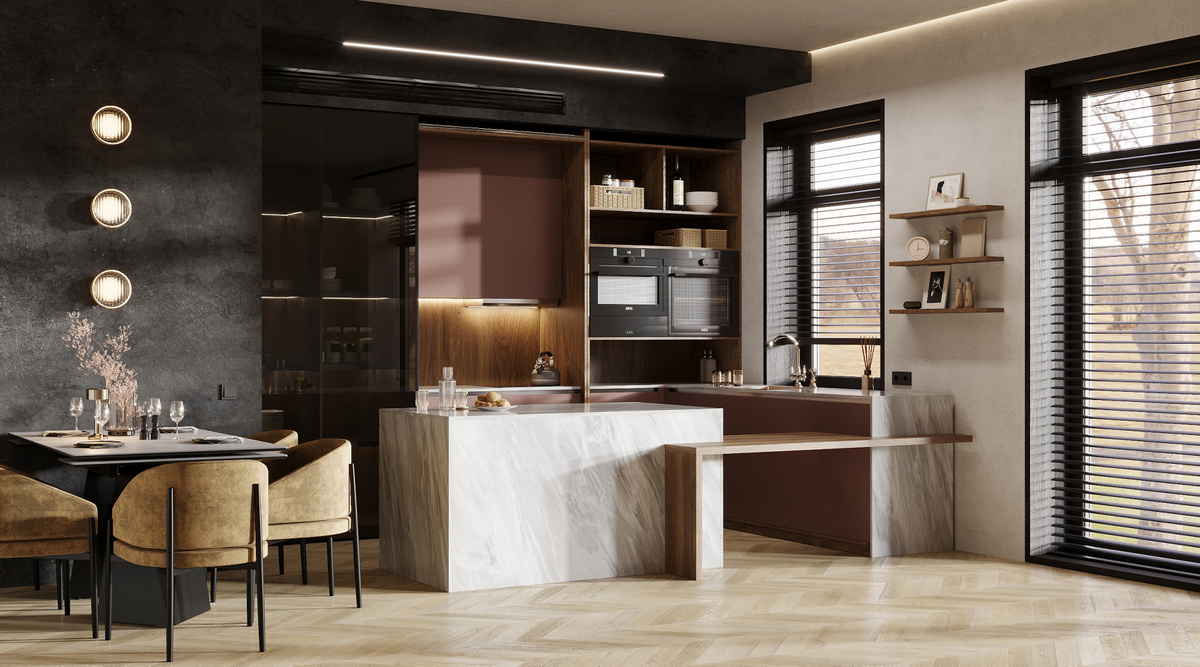 Хотим показать вам идею кухонного гарнитура, который сочетает в себе функциональность, удобство и эстетическую привлекательность. Концепция кухонного гарнитура объединяет в себе функциональность и эстетику, создавая пространство, в котором каждая хозяйка почувствует себя как в профессиональной студии. Эргономичное расположение рабочих поверхностей, продуманная система хранения и стильные фасады создают идеальное рабочее место для кулинарных подвигов. Практичные решения для хранения включают вместительные шкафы с продуманной системой организации, где найдется место для всех кухонных принадлежностей. Отдельные секции для посуды, продуктов и бытовой техники обеспечивают идеальный порядок и быстрый доступ ко всему необходимому. Стильные фасады, выполненные из качественных материалов, не только радуют глаз, но и просты в уходе. Глянцевые поверхности отражают свет, визуально расширяя пространство, а матовые создают уютную атмосферу. Разноуровневое освещение подчеркивает красоту гарнитура и с