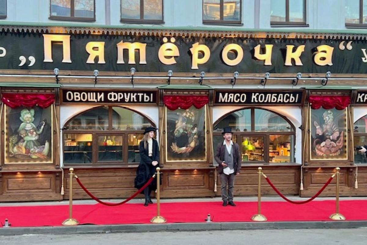 позолота, красные бархатные шторки, а над входом горделиво красуется слово «Пятёрочка», заключённое в кавычки с намёком на орфографию из старых