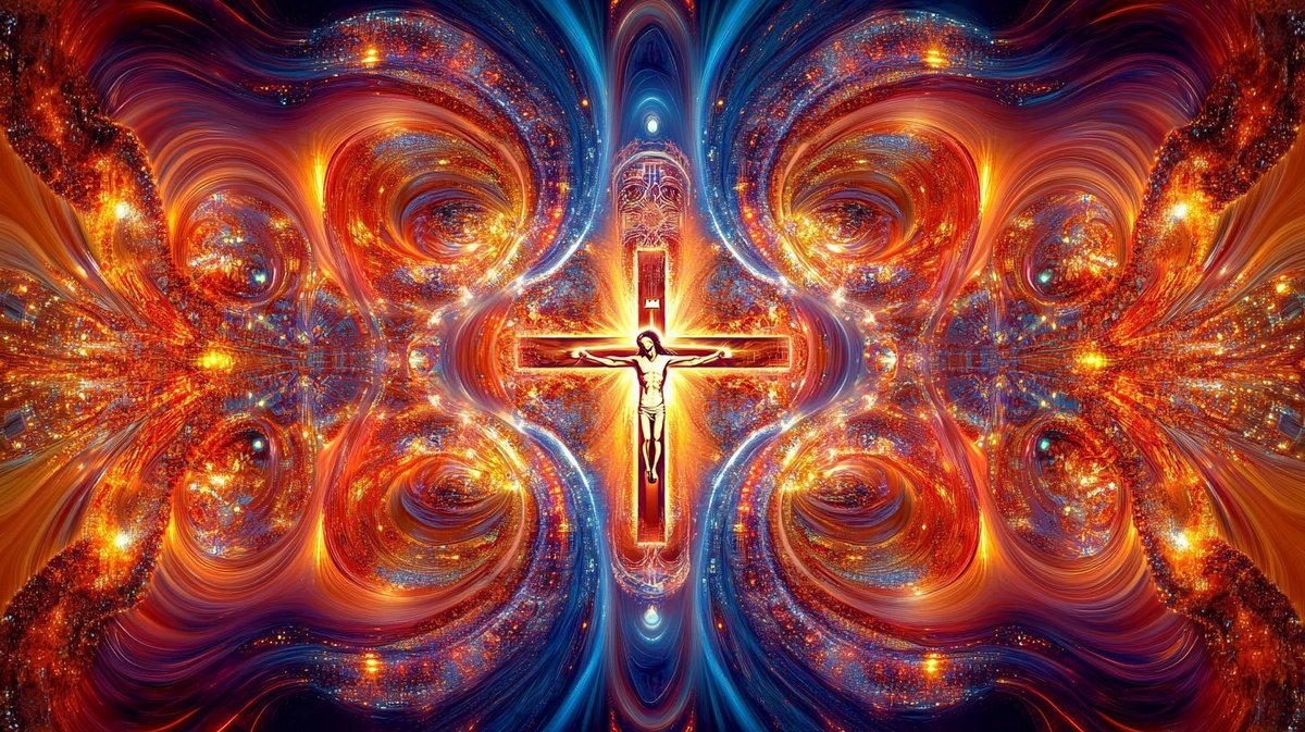 Создано на основе запроса: Stained glass jesus in the cross, all timelines flowing to and from him