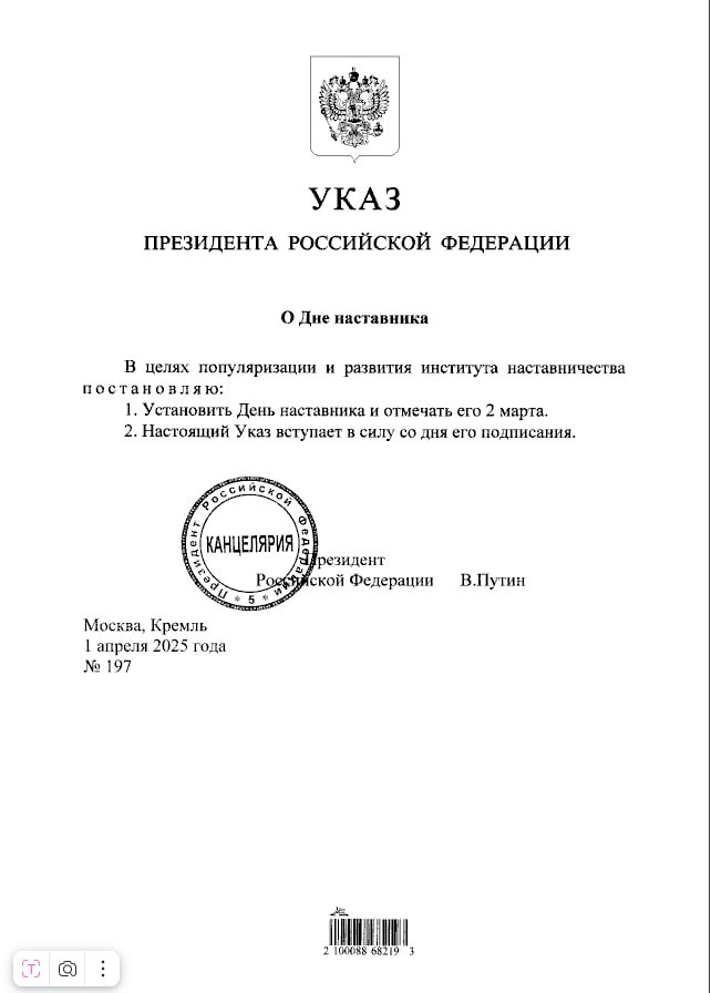 В России утвержден новый праздник 1 апреля президент России Владимир Путин своим указом установил новый праздник – День наставника. «В целях популяризации и развития института наставничества», говорится в тексте документа, опубликованного на официальном портале правовых актов. Указ вступил в силу со дня подписания. Напомним, что 2023 год был объявлен в России Годом педагога и наставника. Старт тематическим мероприятиям дал глава государства 2 марта, когда отмечался 200-летний юбилей со дня рождения основоположника научной педагогики Константина Ушинского. Кроме того, по итогам Года педагога и наставника были введены новые меры поддержки для тех, кто обучает подрастающее поколение и молодых специалистов. Так, например, с 1 марта 2025 года работодатели обязаны платить своим сотрудникам дополнительное вознаграждение за наставничество, которое должно осуществляться на основании письменного согласия работника, а условия его выполнения обязательно прописываются в трудовом договоре или допол