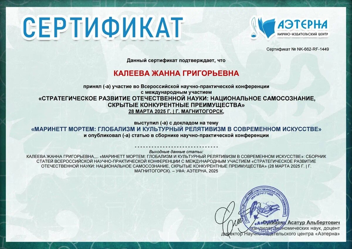 Калеева Ж.Г. Маринетт Мортем: глобализм и культурный релятивизм в современном искусстве // Стратегическое развитие отечественной науки: национальное самосознание, скрытые конкурентные преимущества: сборник статей Всероссийской научно-практической конференции с международным участием (28 марта 2025 г., г. Магнитогорск). - Уфа: Аэтерна, 2025. – 172 с.) С.136-137.