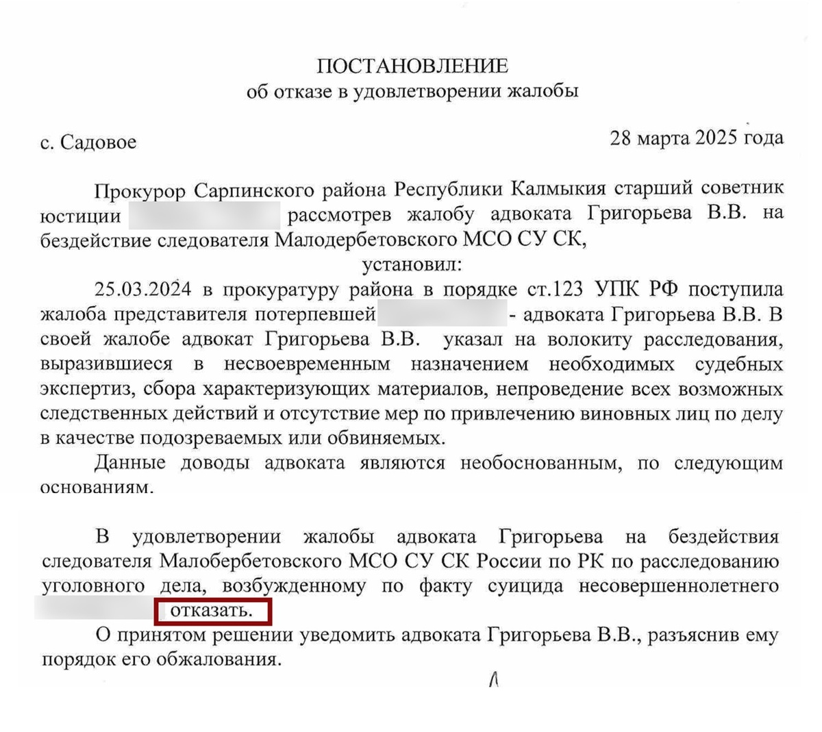 Адвокат из Волгограда Виталий Григорьев работает над громким делом погибшего 14-летнего подростка из Калмыкии . Он сообщил новые подробности нашумевшего расследования. Ранее юрист подал в прокуратуру жалобу на грубую и недопустимую волокиту, так как на момент вступления в дело по прошествии 10 дней, по его мнению, было сделано немного. Официальный ответ прокуратуры гласил, что доводы адвоката «необоснованны», так как якобы следственные действия были проведены, с чем Виталий Григорьев по-прежнему не согласен. — Только вот ни одного подозреваемого до сих пор нет, обвинение никому не предъявлено, хотя прошло уже 20 дней!!! У следствия с самого начала было видео. И, несмотря на это, дело возбудили не в отношении группы лиц, а в отношении неустановленного лица. Хотя на видео — конкретные несовершеннолетние, действия которых привели к трагедии. То есть следствие видело, знало, но квалифицировало преступление при возбуждении без основного признака. Почему? Я понимаю, что это все исправляется,