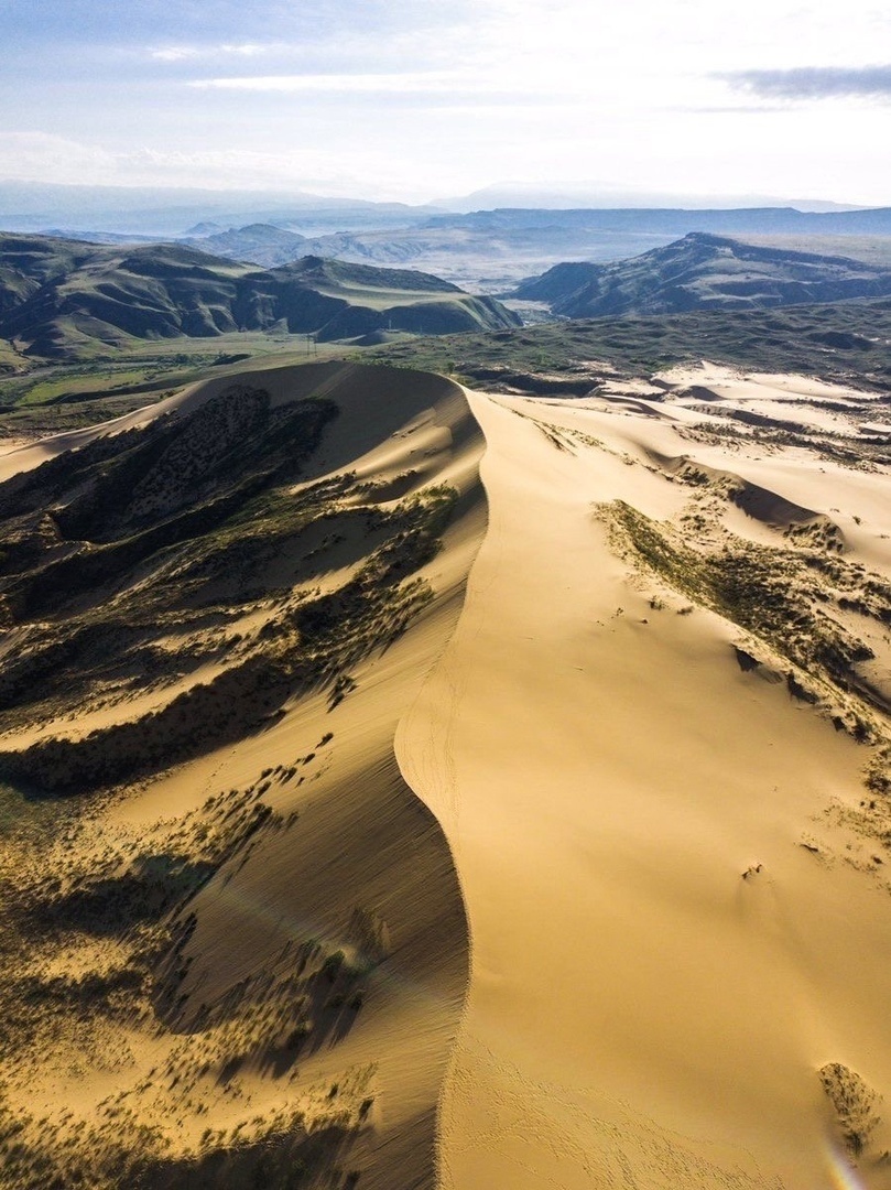 Представьте себе: вокруг зелёные долины и горы, а вы вдруг оказываетесь посреди золотистой пустыни! Здесь снимались кадры из легендарного фильма «Белое солнце пустыни». Бархан невероятно живописен, особенно на закате, когда солнце окрашивает песок в тёплые оттенки золота и янтаря. Говорят, этот бархан возник много веков назад, и его пески скрывают древние тайны.