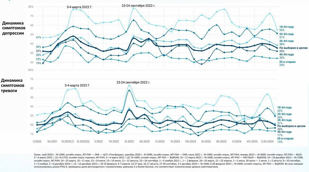 Резюме доклада социолога и первого проректора ВШЭ с Грушинской конференции-2025: - В современной России происходящие один за другим внешние шоки (экономические, эпидемиологические, геополитические) способствуют нарастанию стрессовых состояний - По результатам опроса городской интернет-аудитории почти половина респондентов заявляет, что за предшествующий год переживали нервные расстройства, депрессии или плохое эмоциональное самочувствие, и примерно у каждого третьего за последний год психологическое самочувствие ухудшилось - Более чувствительными к стрессовым состояниям традиционно оказываются женщины по сравнению с мужчинами и молодые люди Многие пытаются не читать и не смотреть новости, чтобы не усугублять депрессию: - Россияне ищут выходы из возникающих стрессовых состояний При сильном уровне психологического стресса примерно каждый пятый обращается к помощи психологов и психиатров (чаще молодые люди), и каждый второй прибегает к употреблению антидепрессантов и успокоительных сред