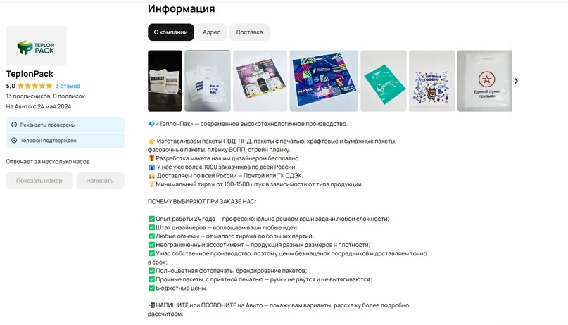 Обратился к нам заказчик Григорий. У него завод по изготовлению упаковочных материалов: пакетов, пленки и т.д. На Авито продвигаться еще не пробовали. Нужно большое кол-во заявок по России. ------