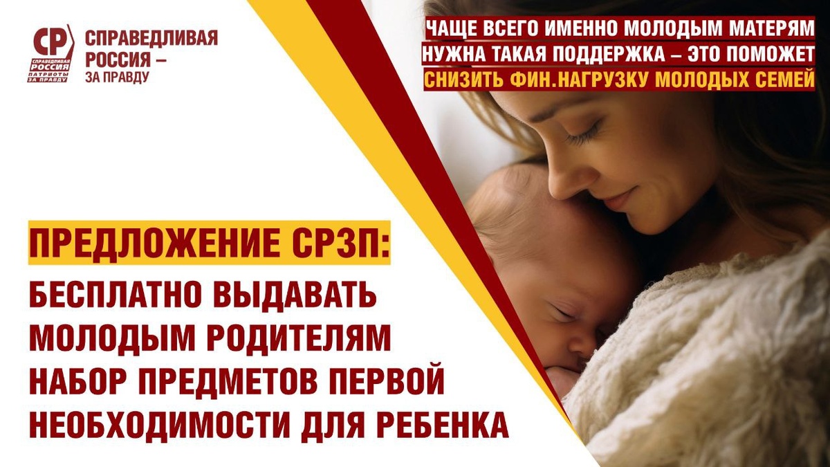 🤍👩🍼 Предлагаем бесплатно выдавать молодым родителям набор предметов первой необходимости для ухода за новорожденным! В столице и ряде регионов женщинам при выписке в роддоме выдают специальный подарочный набор — он включает в себя вещи для малыша, необходимые в первый месяц жизни – одежду, постельное белье, предметы гигиены для новорожденного... Мы убеждены, что такая же поддержка должна оказываться на федеральном уровне. ☝СПРАВЕДЛИВАЯ РОССИЯ - ЗА ПРАВДУ предлагает ввести новую федеральную адресную поддержку молодым семьям, в которых первый ребенок был рожден матерью в возрасте до 23 лет. Это набор предметов, необходимых для ухода за ребенком в первый год его жизни. Предоставление набора снизит финансовую нагрузку на молодые семьи, что крайне важно на фоне роста цен на товары для детей. Официальное письмо по данному вопросу на днях направлено Министру труда и соцзащиты Антону Котякову.