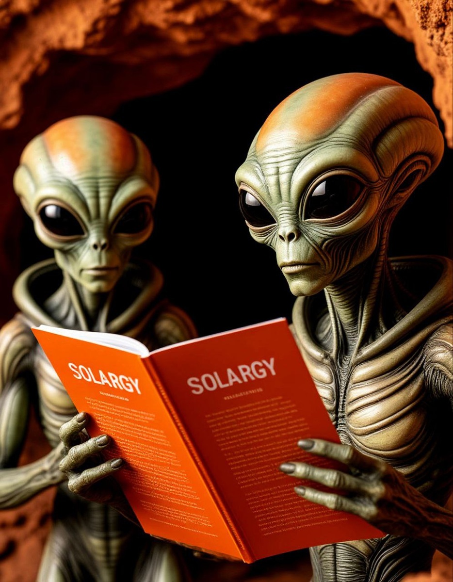 Двое инопланетян на своей летающей тарелке остановились возле Земли и листают каталог Solargy.