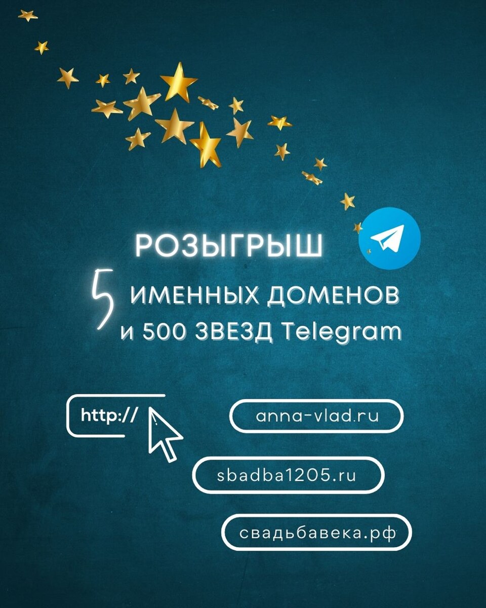 В эту пятницу снова дарим подарки! 5 счастливчиков получат именные домены для свадебных сайтов-приглашений от WeddingPost.ru, а вместе с ними — по 100 звёзд ⭐ в Telegram!