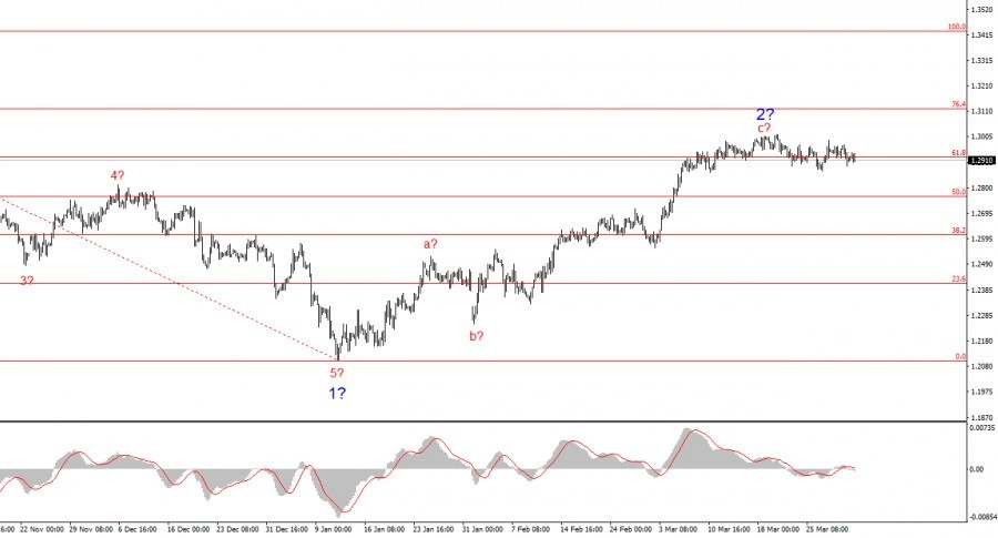 По инструменту GBP/USD волновая разметка остается не самой однозначной, но в целом удобоваримой. В данное время остается высокая вероятность построения долгосрочного понижательного участка тренда. Волна 5 приняла убедительный вид, поэтому старшую волну 1 я считаю завершенной. Если это предположение верно, то сейчас все еще продолжается построение волны 2. Первые две подволны в составе волны 2 выглядят завершенными. Третья – может завершиться в любой момент или уже завершена.