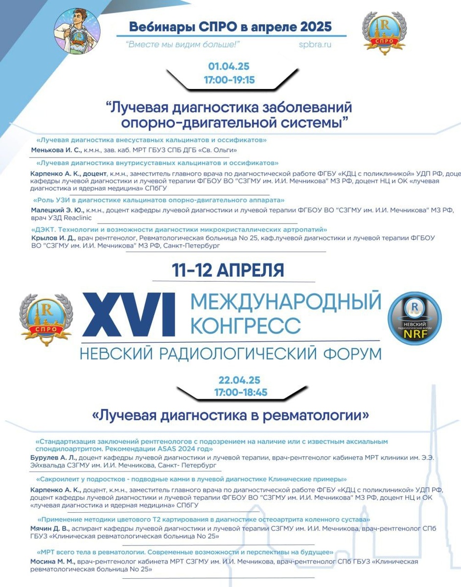 Дорогие друзья! До НРФ-25 осталось 🔟дней. Мы очень ждём с вами встречи☺️ 🔗Зарегистрироваться на Невский Радиологический Форум можно по ссылке: https://www.spbra.ru/lk/nrf/ Апрельскую программу мероприятий можно посмотреть в карточке🔼 2️⃣вебинара РОО «СПРО» 1️⃣Форум. 1.04 начало в 17:00 11.04-12.04 Невский Радиологический Форум 2025 22.04 начало в 17:00 Все вебинары выкладываются на официальном канале в Ютубе/ ВКонтакте / Рутуб только после разрешения лектора. Для получения свидетельства с ИКП НМО просмотр вебинара должен быть только в день его трансляции. 😔Просмотр после проведения в назначенный день не учитывается и сертификаты не выдаются.