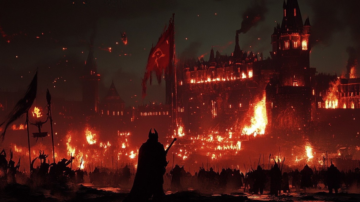 Создано на основе запроса: an dark fantasy army of red and fire demons asault an medieval city, fire effects, embers effects, dramatic, epic, demons everywhere, monsters in the sky, ready for the battle of the end, end of an era, dramatic, pay attention to the details, dark fantasy, dnd style, ink style.