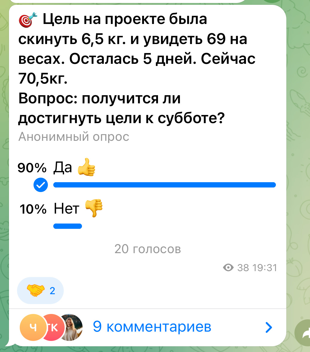 Приветствую, друзья и гости моего канала. Очень греет душу, что вы верите в меня даже больше, чем я сама в себя. Во вчерашней статье я спрашивала, получится ли к субботе увидеть заветную цифру 69 и многие написали, что обязательно получится. Только 2-3 человека сомневаются и я с ними согласна, вес - не предсказуемая штука, то хороший минус, то плюс, то стоит на месте, тут очень трудно предсказать. Будем надеяться 🤞 В моем ТГ канале проголосовали так👇 И да, вы правы, началась гонка за цифрой, включился азарт и погоня. И мне вполне достаточно будет, если весы покажут 69,95😂. На сегодня мой вес - 70,40 кг, но все может изменится, тем более КД не за горами🤷♀️ Огромное вам спасибо за поддержку и неравнодушие♥️ Покажу сегодняшние тарелочки. Завтрак Бейгл с ветчиной, помидором и сыром, съела половину, одно вареное яйцо и кофе с молоком. Перекус Пирог заливной с тунцом и яйцом, конфета протеиновая и кофе. Обед Морской окунь тушеный, рис, огурец и банан. На работе потом пила кофе с конфе