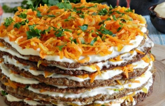 Верхний блин также смазать майонезом, выложить морковь с луком и петрушку. Убрать печеночный торт в холодильник для пропитывания на 2-3 часа.