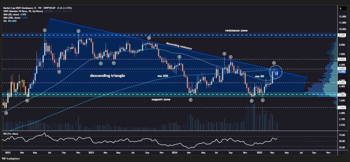 #USDT .D западная закрытая группа: Tether Dominance формирует нисходящий треугольник и в настоящее время удерживается ниже 200-й средней и выше 50-й средней на недельном графике. Пробой ниже 50-й средней может сигнализировать о перетоке капитала из стейблкоинов в криптовалюты, тогда как прорыв из треугольника может привести к более глубокой коррекции рынка.