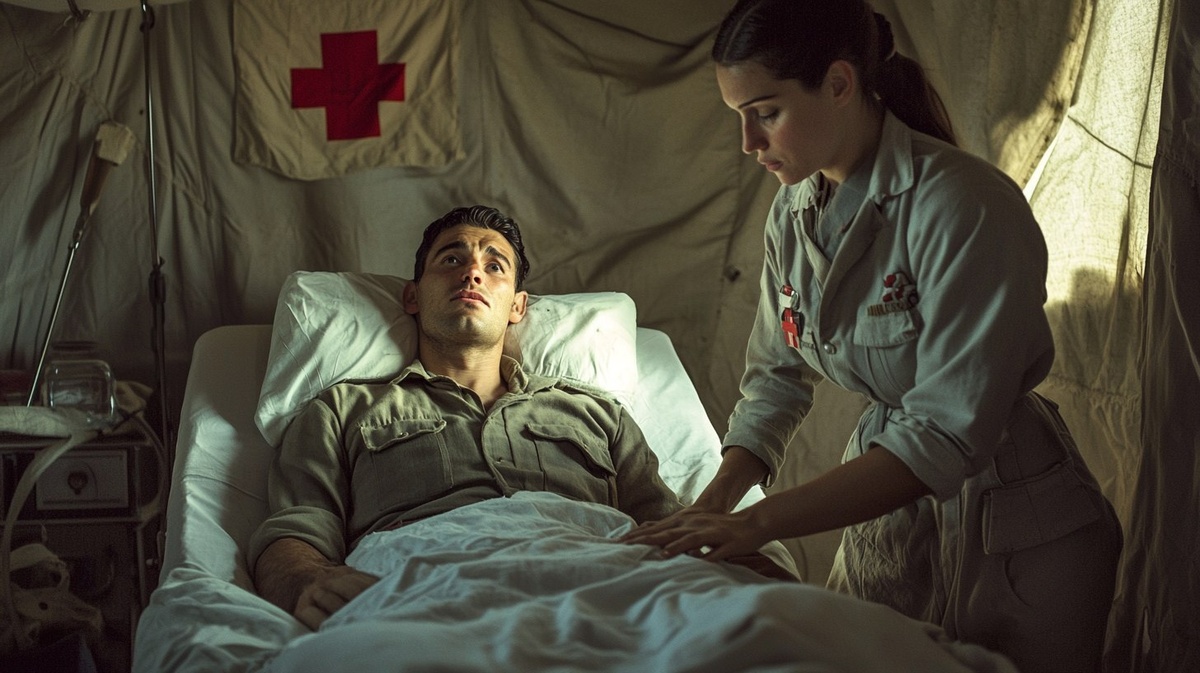 Создано на основе запроса: Inside a quiet World War II field hospital recovery tent, a warm light filters in through the canvas as another