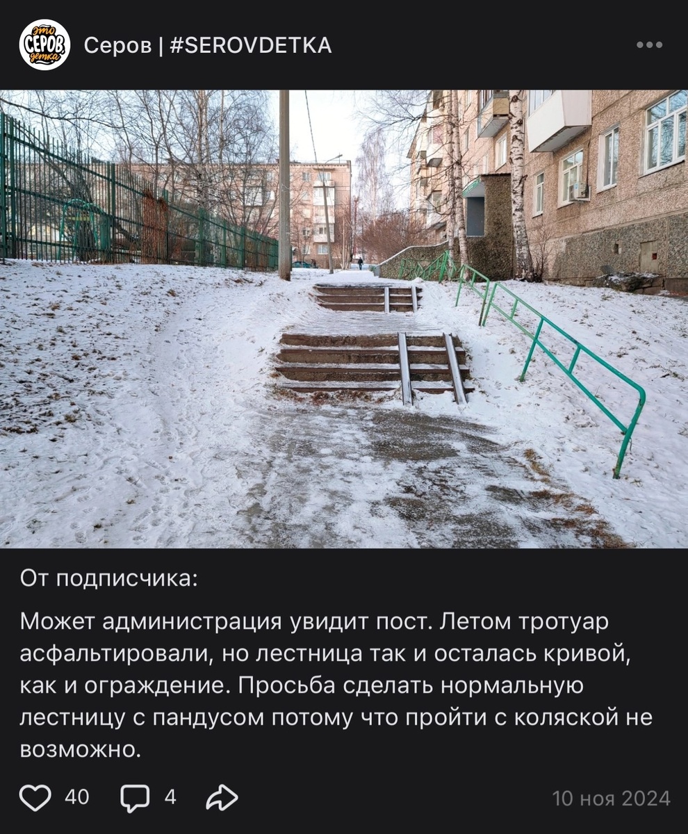 Лестницу на Короленко отремонтируют. А ещё тут будет пандус Мы писали об этой проблеме 10 ноября 2024 года. УКС Серова разместило на сайте госзакупок электронный аукцион на право заключения муниципального контракта на ремонт лестничного марша и устройство пандуса за 823 769 рублей 83 копейки (из бюджета СМО). Итоги торгов подведут 9 апреля, а выполнить работы победитель должен будет с 21 апреля по 30 июня 2025 года.
