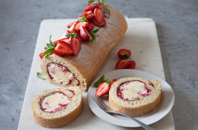 Густая серединка фруктового мороженого, завернутая в восхитительный бисквит с джемом, делает этот рулет идеальным для лета, который можно освоить с помощью нашего простого пошагового рецепта. Список продуктов внизу. Положите в миску 400 г слегка размягченного ванильного мороженого и аккуратно разомните его со 100 г малины, чтобы создать волнистый эффект. Выложите большой лист антипригарной пекарской бумаги (длиной около 60 см) и выложите мороженое вдоль середины бумаги, чтобы получилась колбаска. Оберните бумагу вокруг начинки и скрутите концы вместе, чтобы получился длинный (около 40 см) ровный цилиндр — как рождественская хлопушка. Заморозьте как минимум на 1 час. Тем временем разогрейте духовку до 200°C, вентилятор 180°C. Смажьте маслом и выстелите большую форму для рулета (39 x 26 см) бумагой для выпечки, убедившись, что бумага выступает за края формы. В большой миске взбейте 4 яйца со 120 г сахарного песка до бледного кремообразного состояния. Аккуратно добавьте 120 г просеянной
