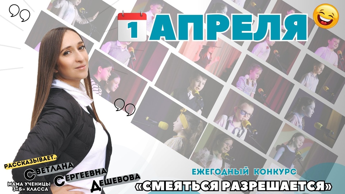 😂 «Праздник, который радует всех без исключения — День смеха! А какой День смеха без конкурса «Смеяться разрешается»? Вот и наша школа 1 апреля не осталась в стороне и отметила этот замечательный день традиционным ярким мероприятием», — рассказывает ведущая рубрики «Школьный экскурсовод» Светлана Сергеевна Дешевова.