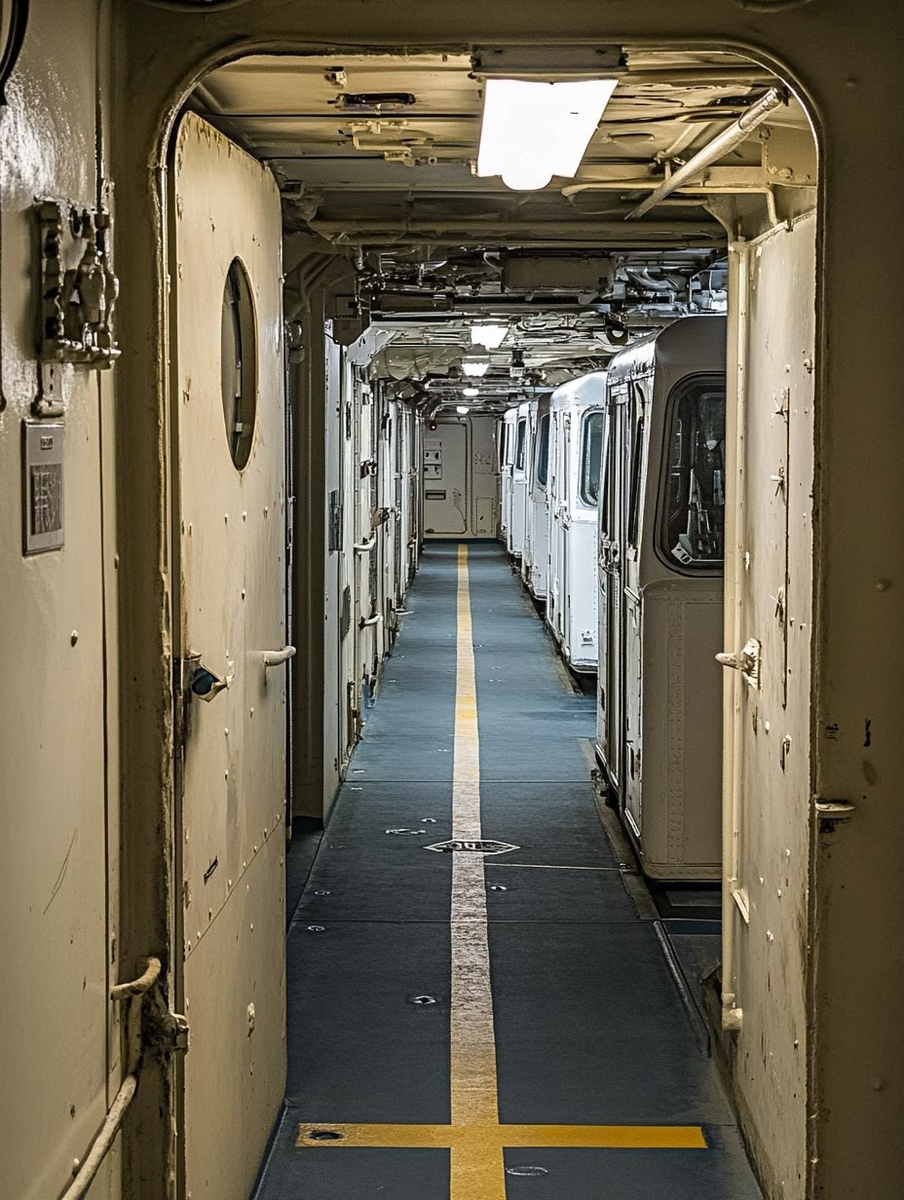 Создано на основе запроса: The narrow hallway of an aircraft carrier, a yellow line on the floor. There is no door in front of me, and I can see into another room through it. There are two white metal airfield buses parked next to each other. The photo was taken from inside the ship.