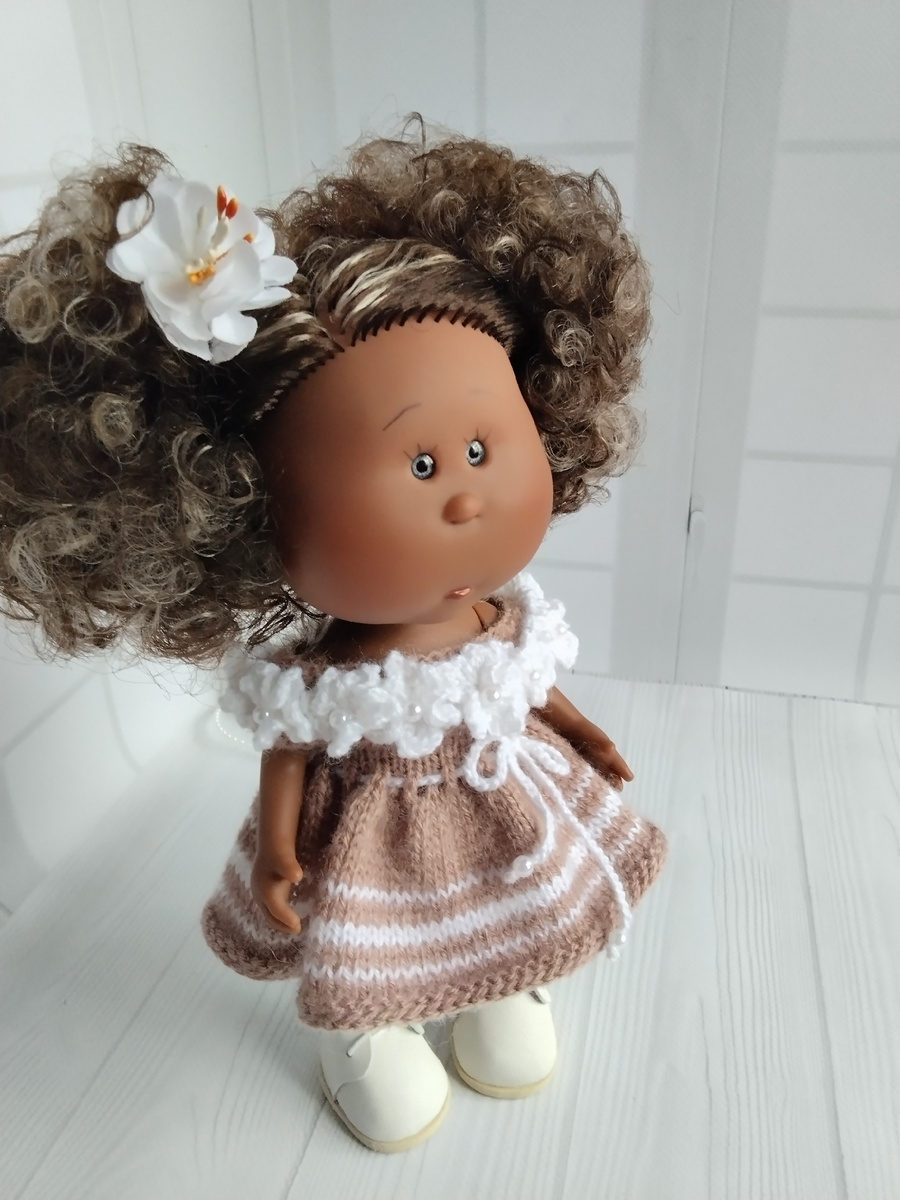 Пряжа - Alize Angora Gold (550 м / 100 гр.) Спицы - № 2. Платье без застёжки, вяжем по кругу. Набираем 51 петлю. 1. 1-ю петлю снимаем, дальше вяжем лицевыми петлями распределяя петли на 4 спицы, последнюю петлю провязываем вместе с первой лицевой, замыкая в круг. 2. Изнаночные петли 3 - 5. Лицевые петли 6. (10 лиц., приб.)* 7 - 9. Лицевые петли 10. Изнаночные петли 11. 8 лиц., 12 петель закрыть, 15 лиц., 12 петель закрыть, 8 лиц. 12. 8 лиц., 2 в.п. (подрезы)- мне крючком удобнее, 15 лиц., 2 в.п., 8 лиц. 13. Вяжем ряд лицевыми петлями и воздушные петельки тоже захватываем и провязываем лицевыми 14 - 17. Лицевые петли 18. (1 лиц., накид)* - и удваиваем петли и дырочки для поясочка. 19, 20. Лицевые петли 21. (2 лиц., приб.)* - прибавки делаем незаметными, я вытягиваю из петли предыдущего ряда. 22 - 28. Лицевые петли Продолжаем вязать лицевой гладью. Добавляем белую нить. 29. Белая нить 30, 31. Бежевая нить 32, 33. Белая нить 34, 35. Бежевая нить 36. Белая нить, обрезаем белую н