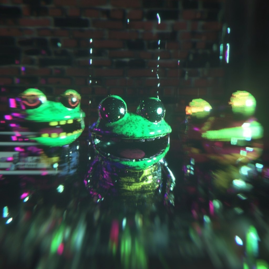 Создано на основе запроса: 4D holographic cartoon graffiti styled frogs,focus on frogs