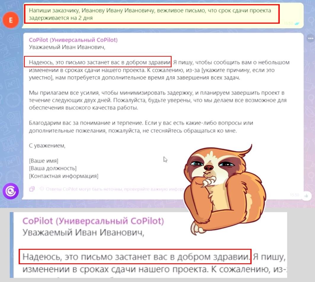 А вот и шутка от ИИ на 1 апреля. Во время тестирования CoPilot для мини-обзора задали промпт — написать письмо для заказчика о задержке сроков. Иван Иванович оценит 👍