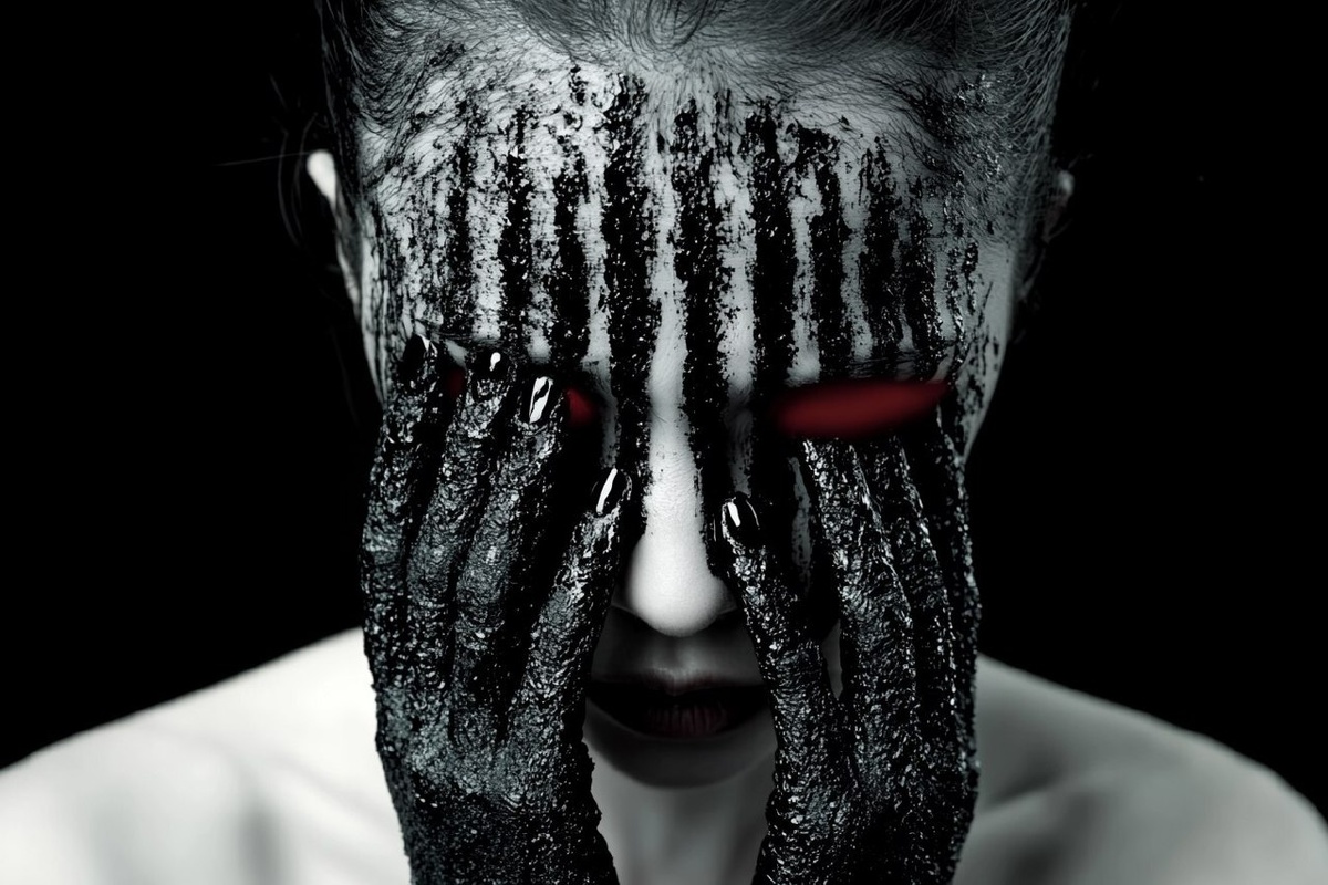 Создано на основе запроса: woman on a photoshoot, 3 lines black paint in her facer cover her eyes, white background, black & white filter